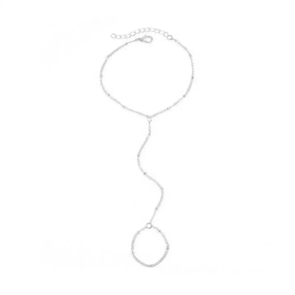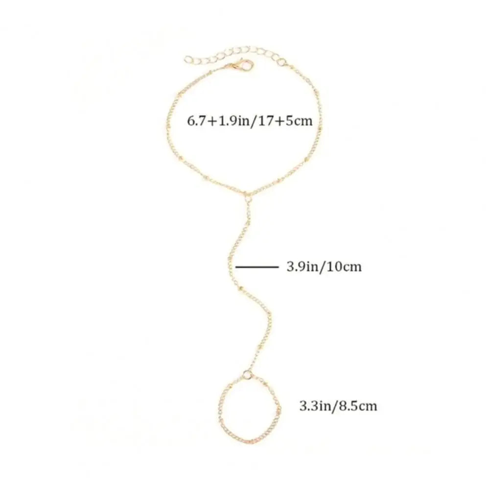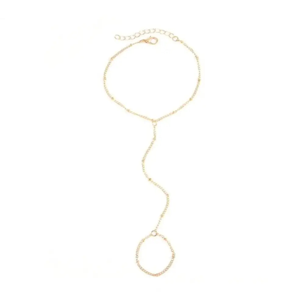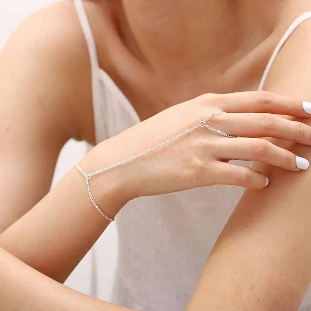 Avec sa chaîne fine reliant le poignet à l’annulaire, ce bijou rappelle les ornements traditionnels revisités dans une version minimaliste et tendance.